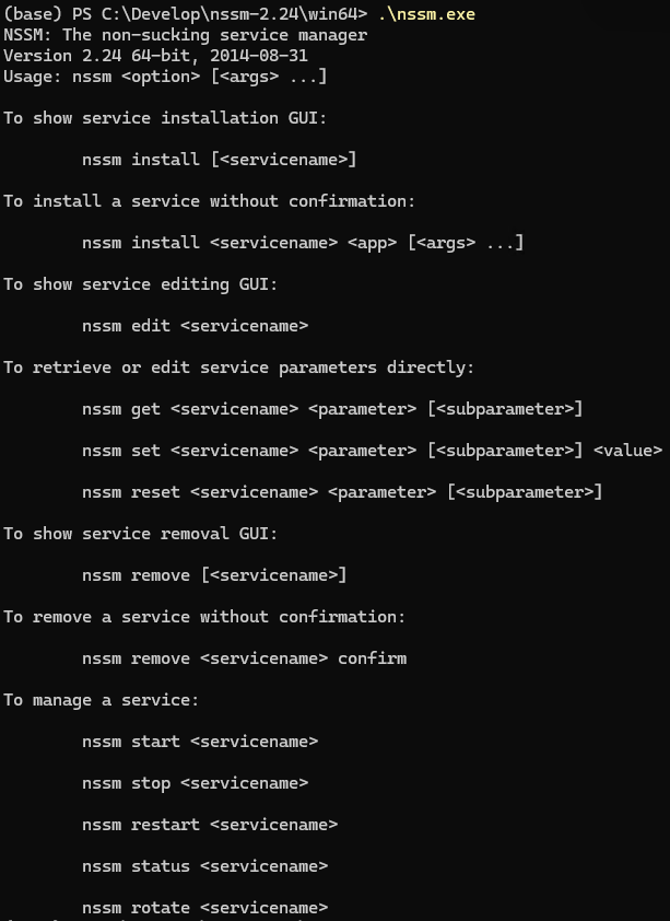 nssm start mxcad_backend2:启动服务nssm stop mxcad_backend2:停止服务,但主程序文件依然被占用nssm remove mxcad_backend2:移除服务,添加confirm则不会弹出确认窗体nssm restart mxcad_backend2:重启服务nssm status mxcad_backend2:查询服务状态