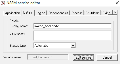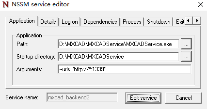 nssm install mxcad_backend2&nssm edit mxcad_backend2