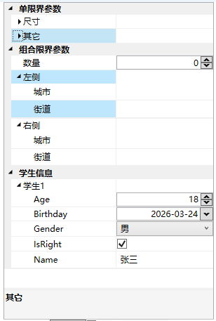 1 2 3 4 5 6 7 8 9 10 11 12 13 14 15 16 17 18 19 20 21 22 23 24 25 26 27 28 29 30 31 32 33 34 35 36 37 38 39 40 41 42 43 44 45 46 47 48 49 50 51 52 53 54 55 56 57 58 59 60 61 62 63 64 65 66 67 68 69 70 71 72 73 74 75 76 [CategoryOrder("单限界参数" ,1) ] [CategoryOrder("组合限界参数" , 2) ] [CategoryOrder("学生信息" , 3) ] public class AppConfig { [Category("单限界参数" ) ] [Display(Name = "尺寸" , Order = 0) ] public ProxySettings Proxy { get ; set ; } = new ProxySettings(); [Category("单限界参数" ) ] [Display(Name = "其它" , Order = 1) ] public ProxySettings Proxy2 { get ; set ; } = new ProxySettings(); [Category("组合限界参数" ) ] [Display(Name = "数量" , Order = 0) ] public int Number { get ; set ; } [Category("组合限界参数" ) ] [Display(Name = "左侧" , Order = 1) ] public Address ContactAddress { get ; set ; } = new Address(); [Category("组合限界参数" ) ] [Display(Name = "右侧" , Order = 2) ] public Address ContactAddress2 { get ; set ; } = new Address(); [Category("学生信息" ) ] [Display(Name = "学生1" ) ] public Student Student { get ; set ; } = new (); } [TypeConverter(typeof(ExpandableObjectConverter)) ] public class ProxySettings { [DisplayName("主机" ) ] public string Host { get ; set ; } = "127.0.0.1" ; [DisplayName("端口" ) ] public int Port { get ; set ; } = 8080 ; [DisplayName("用户名" ) ] public string UserName { get ; set ; } public override string ? ToString() { return "" ; } } [TypeConverter(typeof(ExpandableObjectConverter)) ] public class Address { [DisplayName("城市" ) ] public string City { get ; set ; } [DisplayName("街道" ) ] public string Street { get ; set ; } public override string ? ToString() { return "" ; } } [TypeConverter(typeof(ExpandableObjectConverter)) ] public class Student { public string Name { get ; set ; } = "张三" ; public int Age { get ; set ; } = 18 ; public DateTime Birthday { get ; set ; } = DateTime.Now; public bool IsRight { get ; set ; } = true ; public Gender Gender { get ; set ; } = Gender.男; public override string ? ToString() { return "" ; } } public enum Gender { 男, 女 }